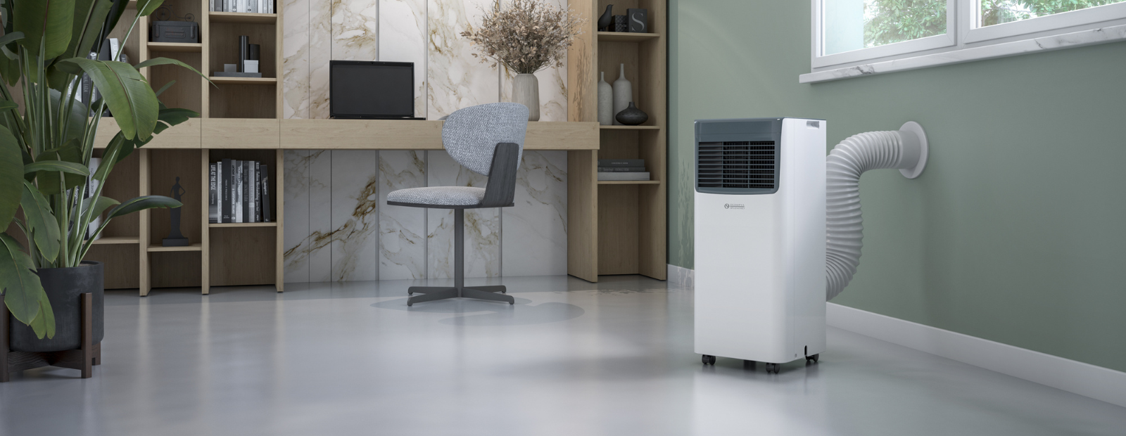 Dolceclima Compact 9 SS è il climatizzatore portatile ideale per ambienti più piccoli, che unisce 9.000 BTU/h* di potenza in un design ultra-slim.